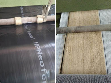 Construction: Geosynthetic Clay Liners can be installed in virtually any weather and onto uncured concrete making it ideal for waterproofing under slab and at property line applications. When used in construction applications, natural sodium bentonite’s swelling action can self-seal small concrete cracks caused by ground settlement, concrete shrinkage or seismic action. During installation a strong mechanical bond is formed when wet concrete solidifies around the fabric fibres. The waterproof membrane can be installed directly over a properly prepared substrate without the need of a concrete mud slab.